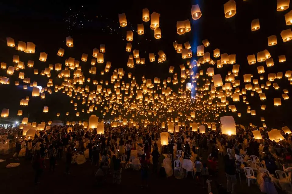 チェンマイのコムローイ祭りは、夜空にランタンが浮かび上がる幻想的な体験ができる特別なイベントです。