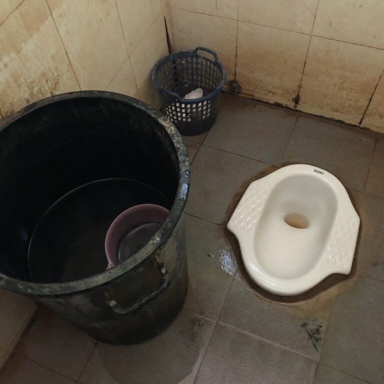 ……。こんな簡易的なトイレ、生まれて初めてみました。この桶の中には水が溜めてあります。これがウォシュレット代わりなのかな…?僕はティッシュを持ち歩いていたので助かりました。