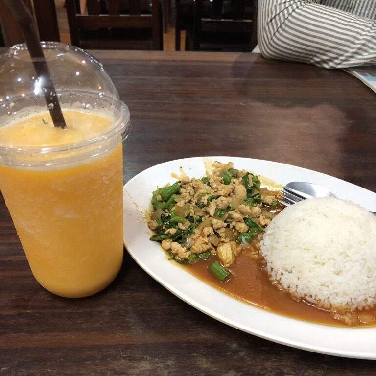 ガパオライスとマンゴースムージーを注文。ガパオは優しい味付けでめちゃくちゃ美味かった。日本人の味覚に合わせたタイ料理、という印象を受けました。てか久しぶりにローカルっぽいものを食べた気がする。これでなんと約350円!驚愕の安さ。