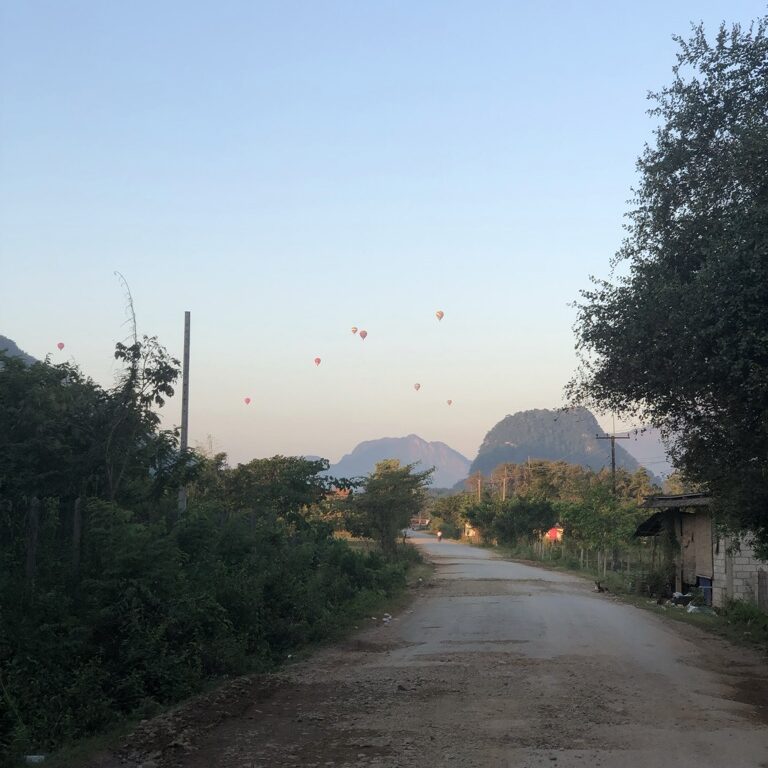 そして感動的だったのは、夕焼けに照らされた熱気球。色とりどりの熱気球が大自然の中を浮遊する光景は幻想的でした。まるで「ようこそバンビエンへ」と盛大に歓迎されているようだ…。